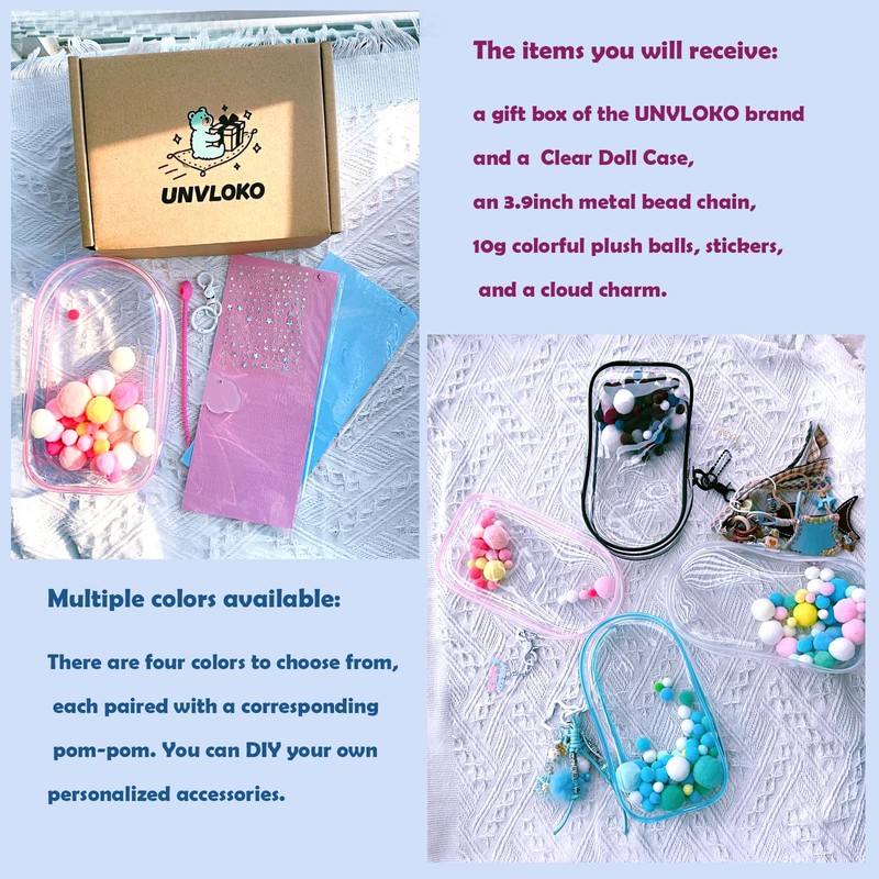 - 1.Complete Collectible Display Case The perfect display case for 17cm doll figures (measuring 19cm/7.5×4.2in). It includes a metal keychain clip, an 3.9inch metal bead chain, 10g colorful plush balls, stickers, and a cloud charm—an ideal storage solution for blind box collectibles!