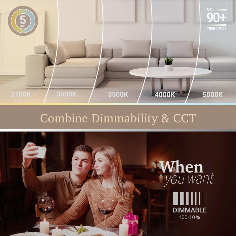 - Five Color Changing Options – NuWatt’s 4 inch LED recessed lights in black trim offers 5 color temperature options from 2700K soft white, 3000K warm white, 3500K neutral white, 4000K cool white, or 5000K daylight for both homeowners and contractors.