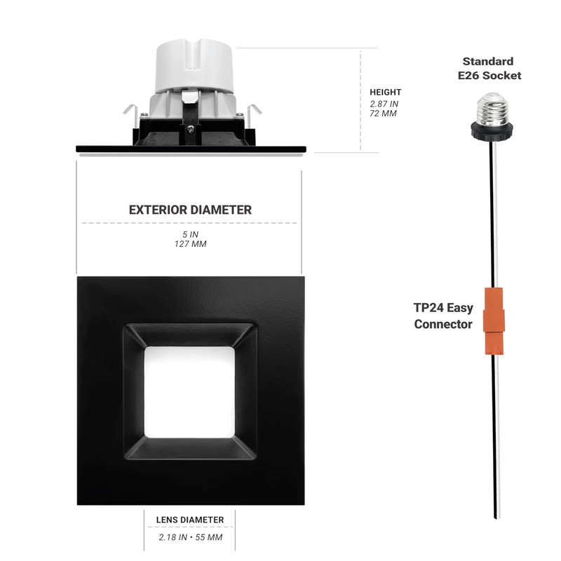 - Easy Retrofit Can Installation – The NuWatt retrofit square recessed light features a quick connect TP24 connector and E26 base adapter, compatible with standard bulb bases for easy installation.