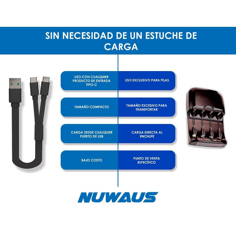- Conecta directamente las pilas a las entradas del cable tipo C, el paquete ya trae incluido un conector con salida USB y cuatro entradas tipo C. El cargador de pared con puerto USB no viene incluido.