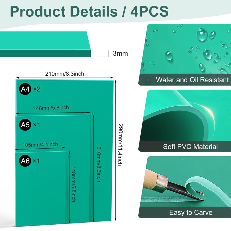 - Package contents: you will receive 4 linoleum blocks. 2 linoleum plates A4, 1 linoleum plate A5, 1 linoleum plate A6 and is 3 mm thick, the ideal size for your printing work. The lino plates can be cut into small parts, and you can effortlessly create your own stamps or printing blocks. Carve the desired shape and then apply with water-soluble and oily block printing ink.