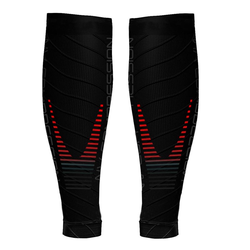 NV Compression Essential Race and Recover Calf Guards/Sleeves (PAIR) 20-30mmHg - For Sports Recovery, Shin Splints, Medical, Work, Flight - Running, Cycling, Gym (Black/Red Stripes, S-M)