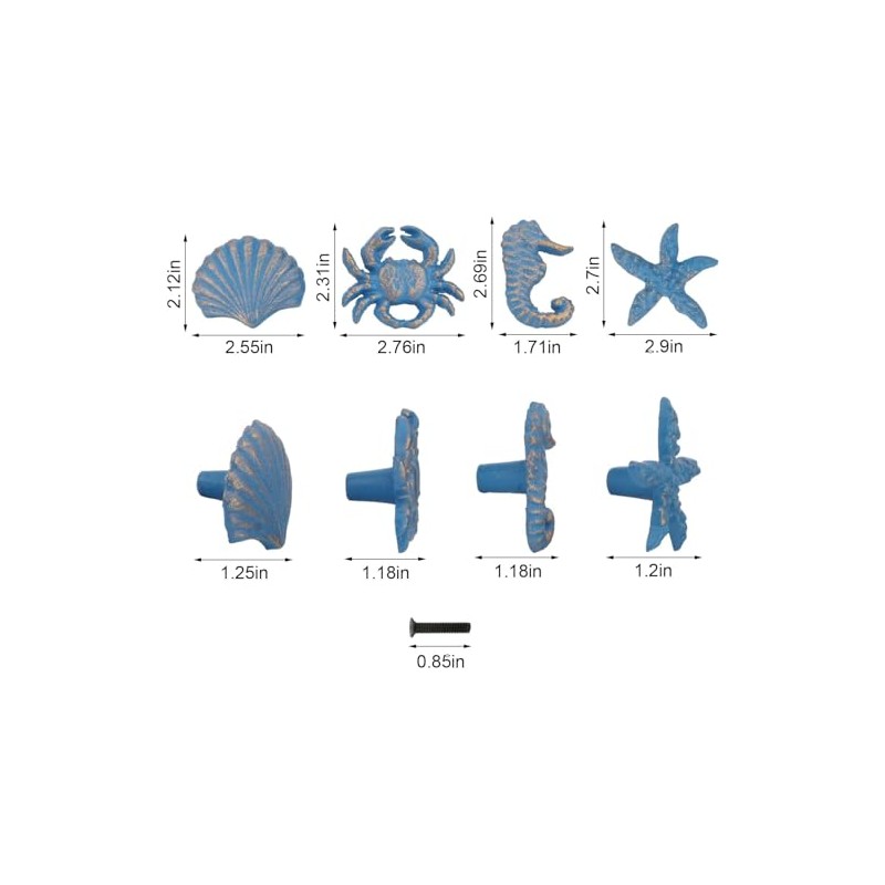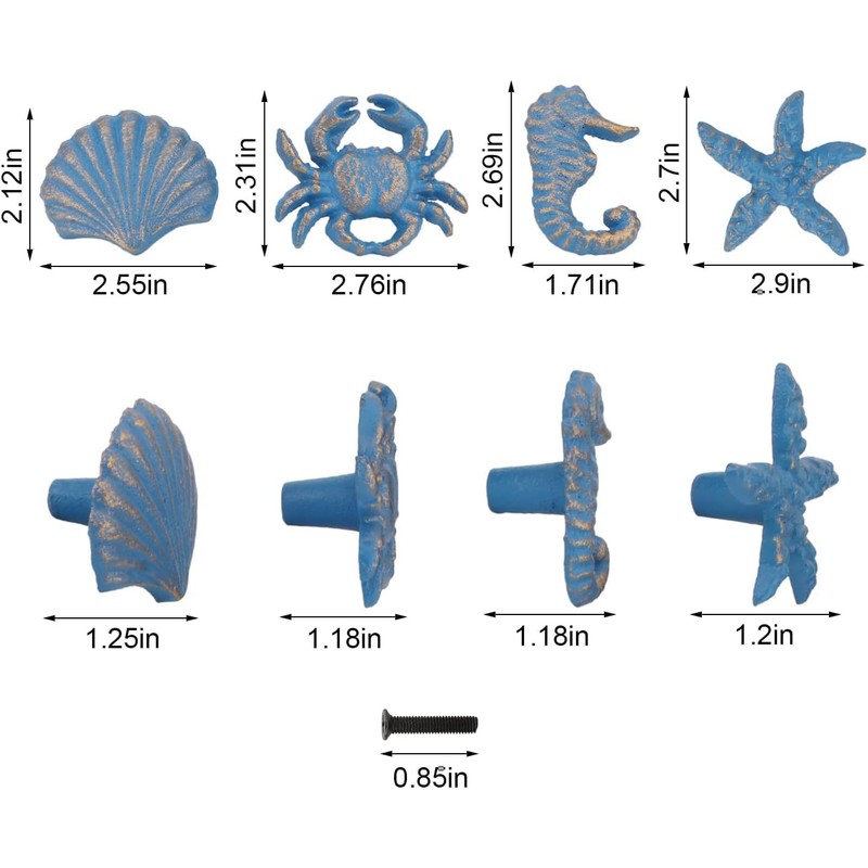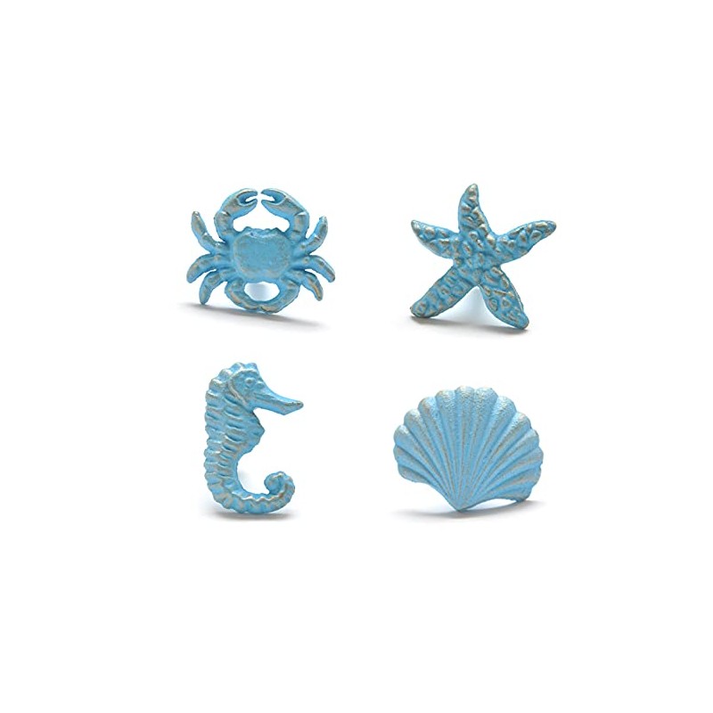 • Package Included:Set of 4 cast iron ocean theme cabinet knobs. Starfish, Seahorse, Seashell and Crab.