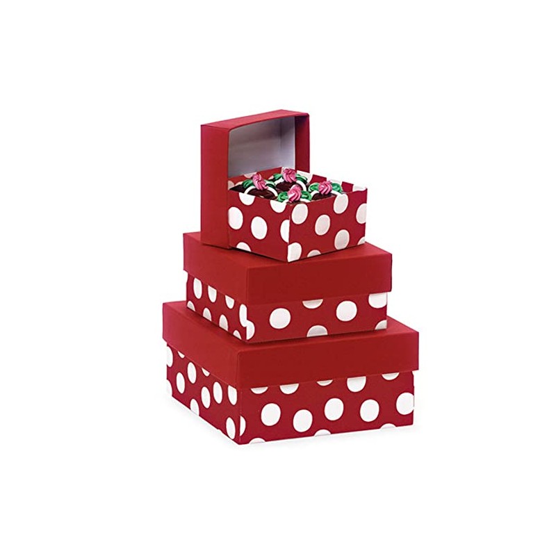 This Small Nested Gift Box Set of 3 features a red with white polka dots base with solid red lid. Inside dimensions of boxes: small 3in. x 3in. x 1-1/2in.; medium 4in. x 4in. x 2in.; large 5in. x 5in. x 2-1/2in. Outside Dimensions of boxes: small 3-1/4in. x 3-1/4in. x 1-5/8in., medium 4-1/4in. x 4-1/4in. x 2in, large 5-1/4in. x 5-1/4in. x 2-5/8in. Made in the USA. These small nested gift boxes will add a decorative touch for special gifts, Wedding table or party centerpieces. They are versatile enough to also be used for gourmet candy sets or small gifts.Sturdy cardboard boxes with lids.