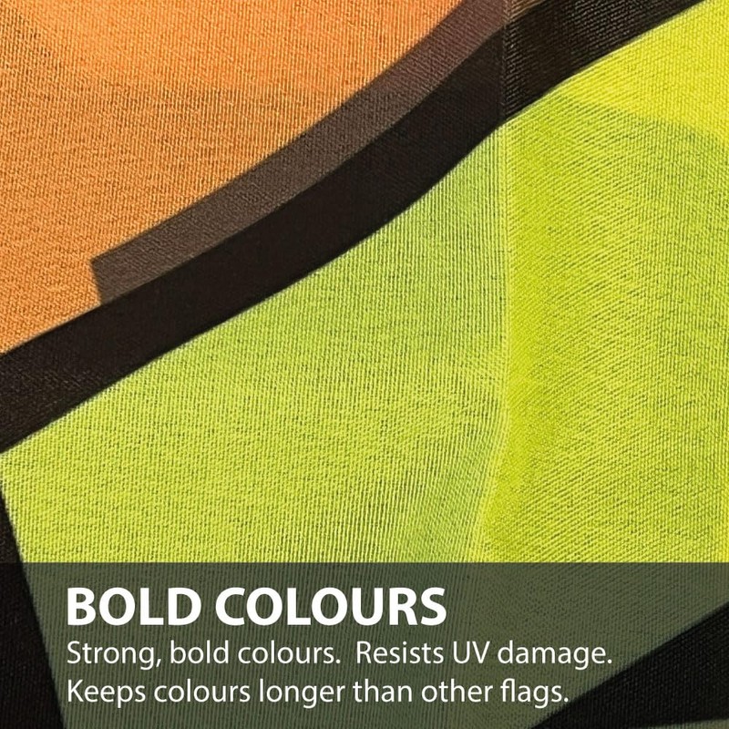 Happy Birthday Orange Flag design is screen printed on strong 75 denier polyester material. Colourfast printing means that the colours stay stronger and more vivid for longer. 2 strong brass eyelets allow you to attach the flag to a flagpole and the two rows of stitching around all four edges help to delay fraying. Our flags are ideal for indoor and light outdoor use.