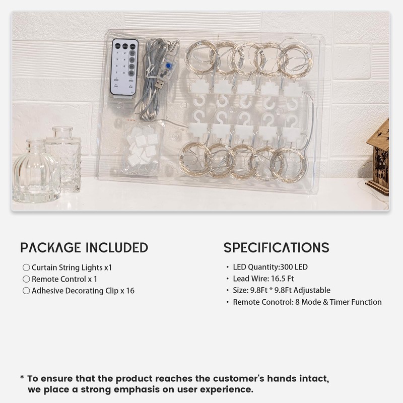 • ENERGY-EFFICIENT & IP65 WATERPROOF - Our twinkle lights curtain measures 9.8x9.8 ft and uses LED light sources, providing greater brightness with less energy consumption, making them energy-efficient and environmentally friendly. These outdoor curtain lights are IP65 waterproof, allowing for outdoor use even on rainy days without issue. NOTE: The USB port is not waterproof, so avoid using it in direct exposure to water. These lights are perfect for both indoor and outdoor curtain lights needs.
