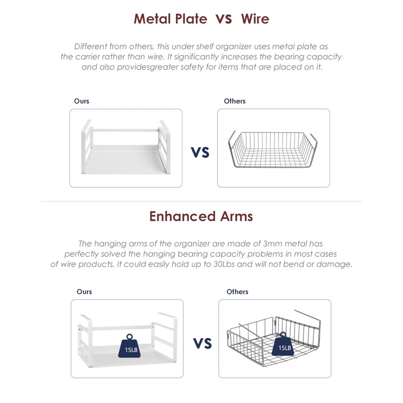 • Great Structure: This under-shelf basket uses a metal plate instead of flimsy iron wire, vastly enhancing its bearing capacity and allowing it to hold up to 15LBS. The thickened hanging arms are made of 3nm metal, increasing the whole stability of the basket and preventing it from falling. It also has a rust-proof coating, making it heavy-duty and for lifetime of use.