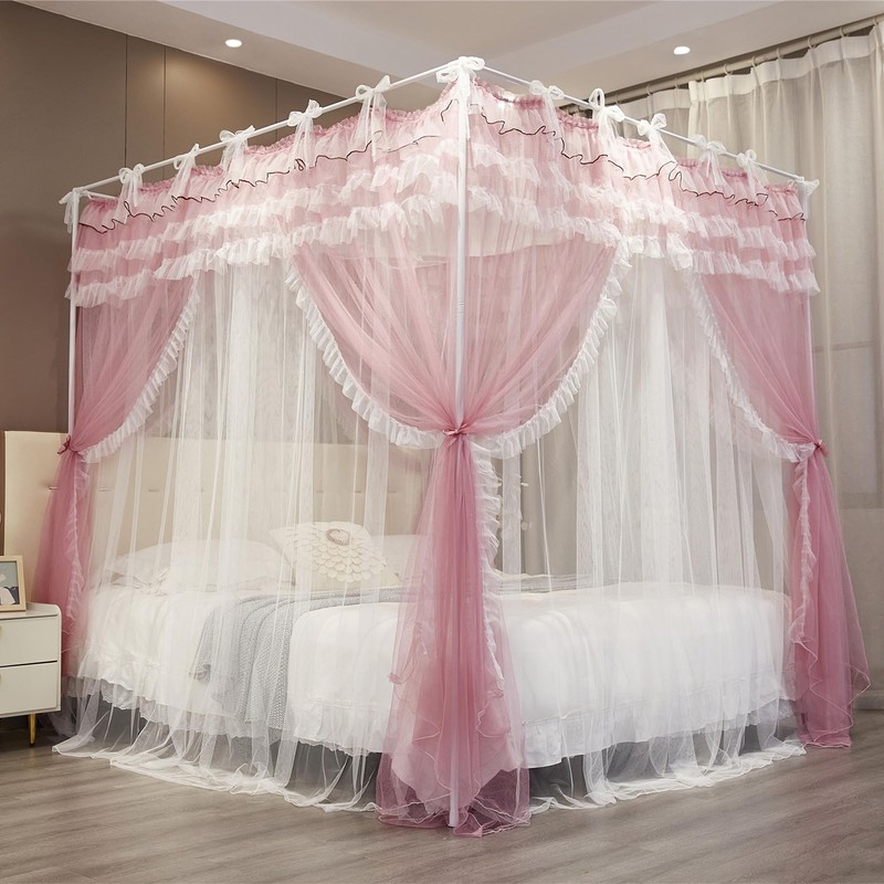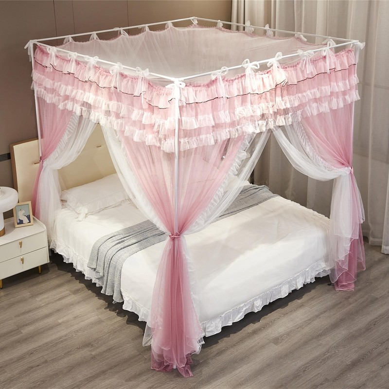 NXGIO Bed Canopy Curtain Double Layer 4 Corners Post Lace Up Ruffle Princess Drape Netting 4 Opening Mosquito Net for Girls Bedroom Decoration (Pink/White, 59" W*82" L*82" H/Queen)