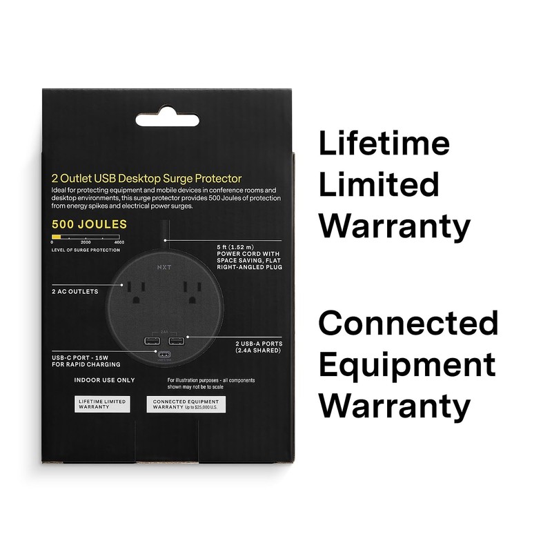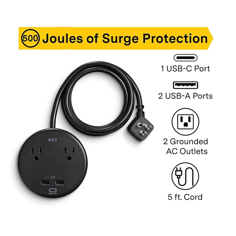 NXT Technologies 2-Outlet Plus USB Desktop Surge Protector, 5-ft Cord, 500 Joules (NX61428)