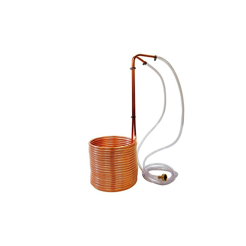 With twice the copper of our standard 3/8 chiller , this unit provides faster cooling for larger batches; Vinyl tubing; High quality brass hose adapter; Stainless steel hose clamps solidify the structure of the chiller, and allow for adjustability in the coil spacing and height. ; Approximate 24 height to top bend of chiller - Tall enough to fit over the lip of a Keg Kettle