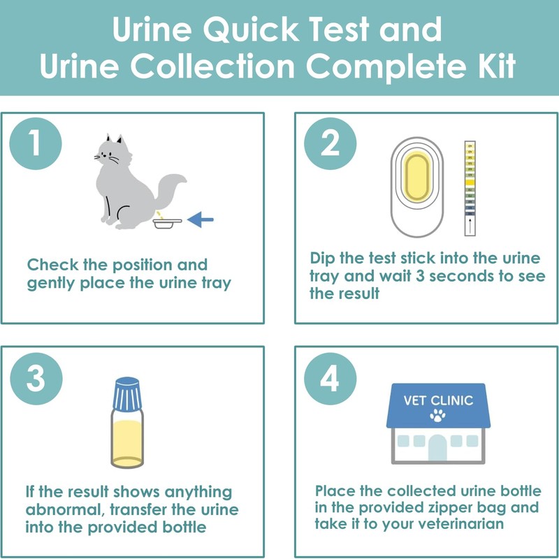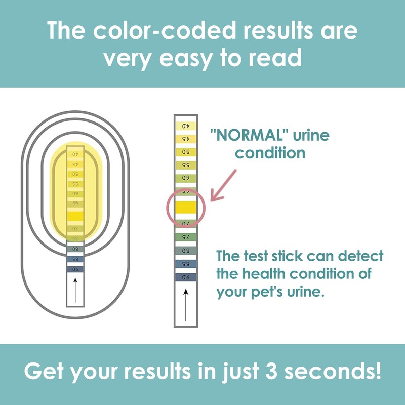 - đ±đ¶ă2 WAYS - URINE TEST & URINE COLLECTIONă Urine test results are simple, easy and accurate, with results available in just 3 seconds. Color-coded results are easy to read and provide a visual indication of your pet's good or bad health. These pet test strips help reduce the need for frequent vet visits. If a negative result is detected, simply collect a urine sample in the included dropper bottle and take it to your vet.