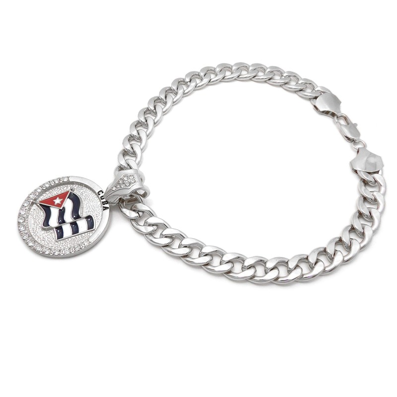 NYFASHION101 Flag Medallion Pendant with 11mm Cuban Chain Necklace, Cuba, Silver-Tone, 18"