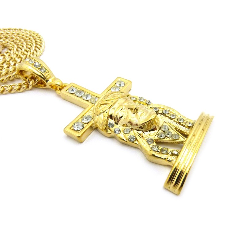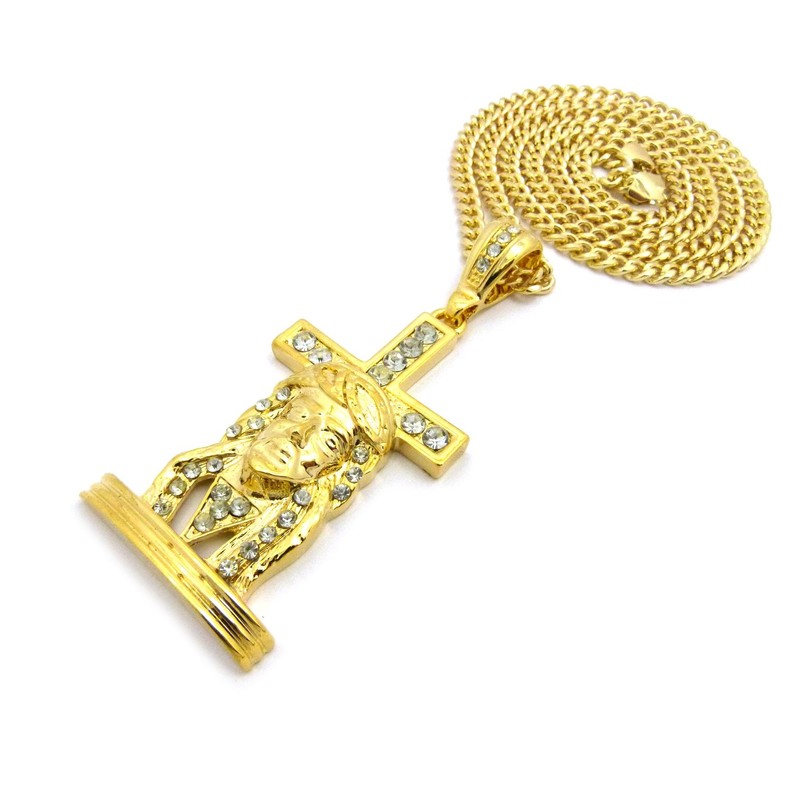 - Jesus Head on Stone Stud Cross Pendant with Cuban Chain Necklace