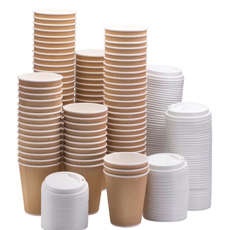 NYHI Set of 100 Brown Disposable Paper Cups with White Lids (12-oz) | Ripple ...