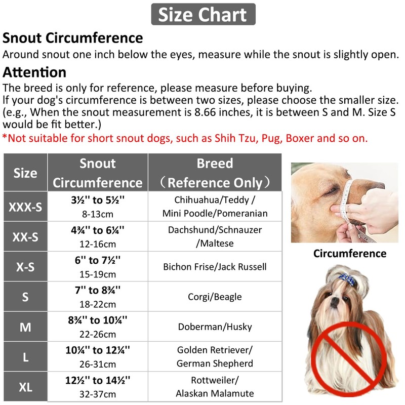 - MUZZLE for SMALL DOGS: This secure muzzle is ergonomically designed for dogs with a long snout, not suitable for short snout dogs such as Pit Bull and Boxer. Size S is suitable for snout circumference between 7" and 8¾". Please measure twice before buying. The small dog muzzle is fit for Beagle, Corgi, Border Collie, and so on. If you have any problems with sizing, we are happy to help you.
