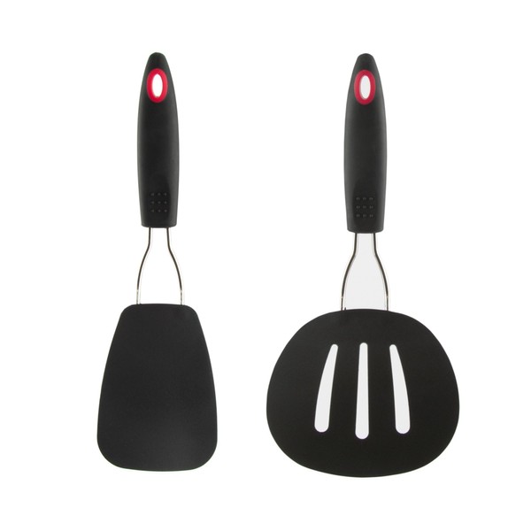 This turner/spatula duo covers a variety of cooking needs, from breakfast to dinner foods! This set includes one nylon flexible turner and one round slotted turner. The flexible turner is perfect for flipping fragile foods while keeping them intact. The nylon head easily slides beneath foods making food easy to lift. The round slotted turner has a wider surface and round shape perfect for flipping pancakes, omelets, burgers and more. Both have high heat resistant nylon heads with a soft-grip nylon handle, and are dishwasher safe. Flexible Turner dimensions: 11-1/2" Length, 4-3/4" Handle, 4-5/8" Head Width x 3-1/4" Head Length. Round Turner Dimensions: 11-1/8" Length, 4-3/4" Handle, 4-1/2" Head Width x 5-1/8" Head Length.