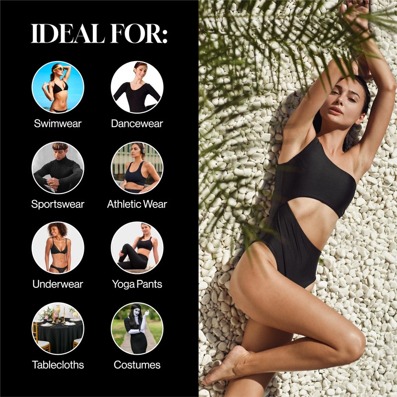 - *Versatile Applications - Our Nylon Spandex Fabric is perfect for a wide range of uses. Primarily ideal as swimwear material, swimsuit lining, and swimwear fabric, this versatile fabric also excels in sportswear, athletic wear, activewear, yoga pants, leggings, and even creative uses in fashion and apparel design, tablecloths, and seat covers.