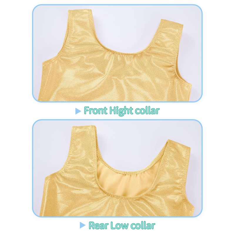 - Stylish Design : This shiny sleeveless gymnastics leotards uniforms is paired with sparkling shorts, higher neckline at the front and lower neckline at the back, ensuring good coverage on the chest, allowing judges and spectators to focus on their skills and form, making your girl stand out.
