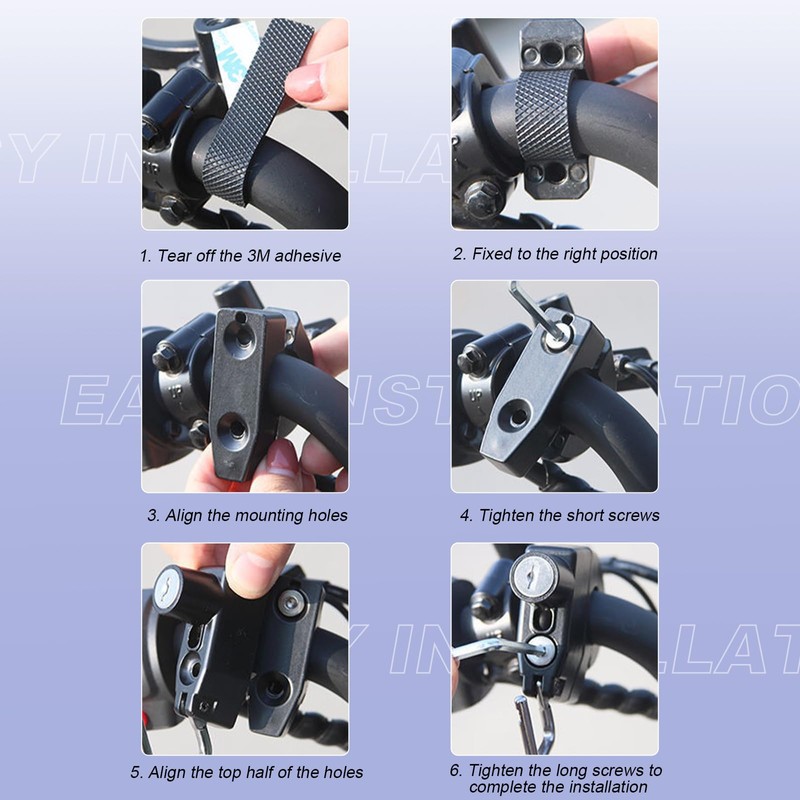 - Easy Installation: First, slide the spacer onto the screws, then secure the base onto the handlebar and tighten the screws. Next, insert the lock body into the base and lock it in place. This straightforward process requires no extra tools, taking just a few minutes for quick installation
