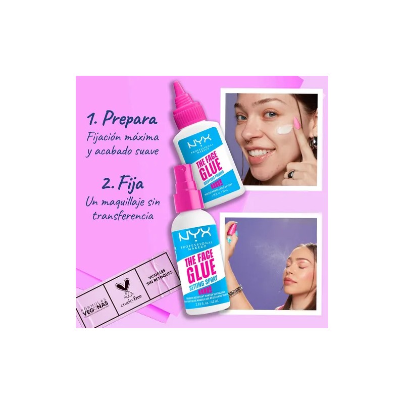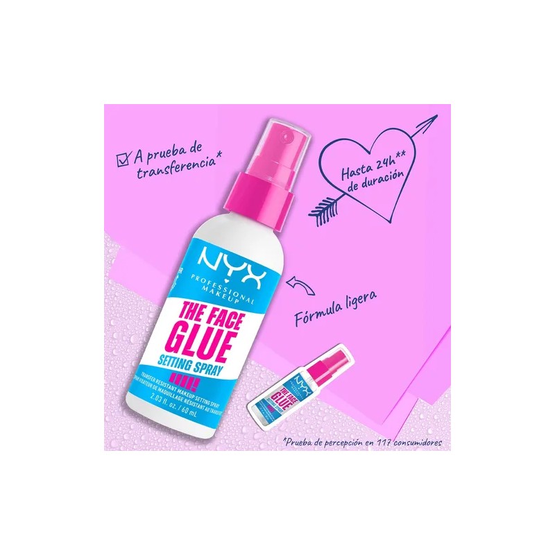 Descubre el nuevo Face Glue Setting Spray de NYX Professional Makeup, tu aliado esencial para un maquillaje impecable que dura hasta 24 horas. Este innovador fijador sella tu look con una adherencia de nivel ""pegamento"", sin dejar ninguna sensación pegajosa en tu piel. Su poderosa fórmula, resistente al agua, a transferencias y a desvanecimientos, asegura que tu maquillaje permanezca intacto y vibrante durante todo el día. Diseñado para ofrecer un acabado natural y ligero, este spray es la clave para prolongar la vida de tu look sin importar las condiciones.