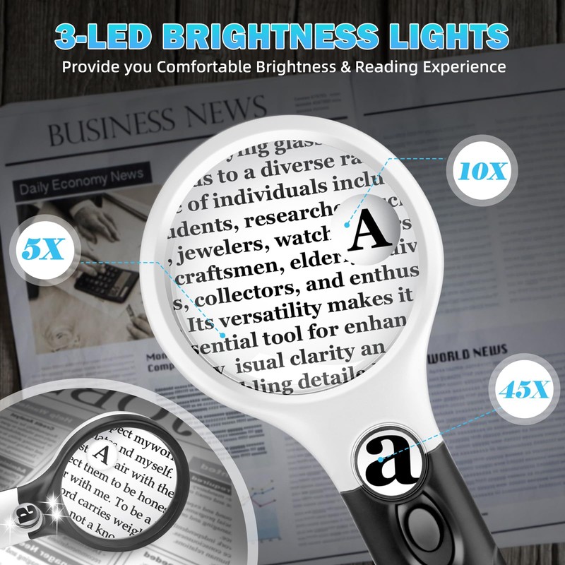 NZQXJXZ Compact Magnifying Glass with Lights,45X 10X 5X Small Handheld Lighted Magnifier, 3 LED Light Magnifying Glass for Reading Small Prints & Low Vision Seniors B&W