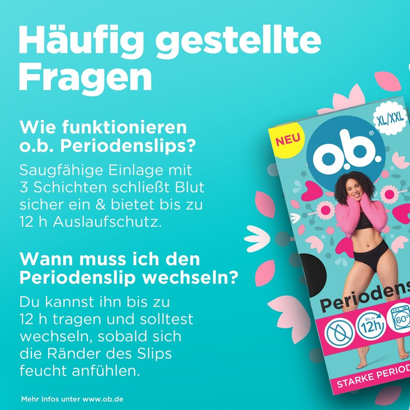 - Lieferumfang – 3 x o.b. Periodenslip in Größe XS / S, wiederverwendbare Periodenunterwäsche bei starker Menstruation für bis zu 12 Stunden Auslaufschutz, besonders bequem, saugfähig & wiederverwendbar, o.b. ist der Menstruationsexperte deines Vertrauens mit über 70 Jahren Erfahrung