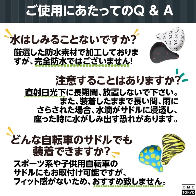 - ※お願い事※ 直射日光かに長期間の放置をご遠慮ください。また、装着したままで長い間、雨にさらされた場合、水滴がサドルに浸透し、座った時に水が染みだす恐れがあります。ご注意願います。また、お使いのモニターの発色具合によって、実際のものと色が異なる場合がございます。