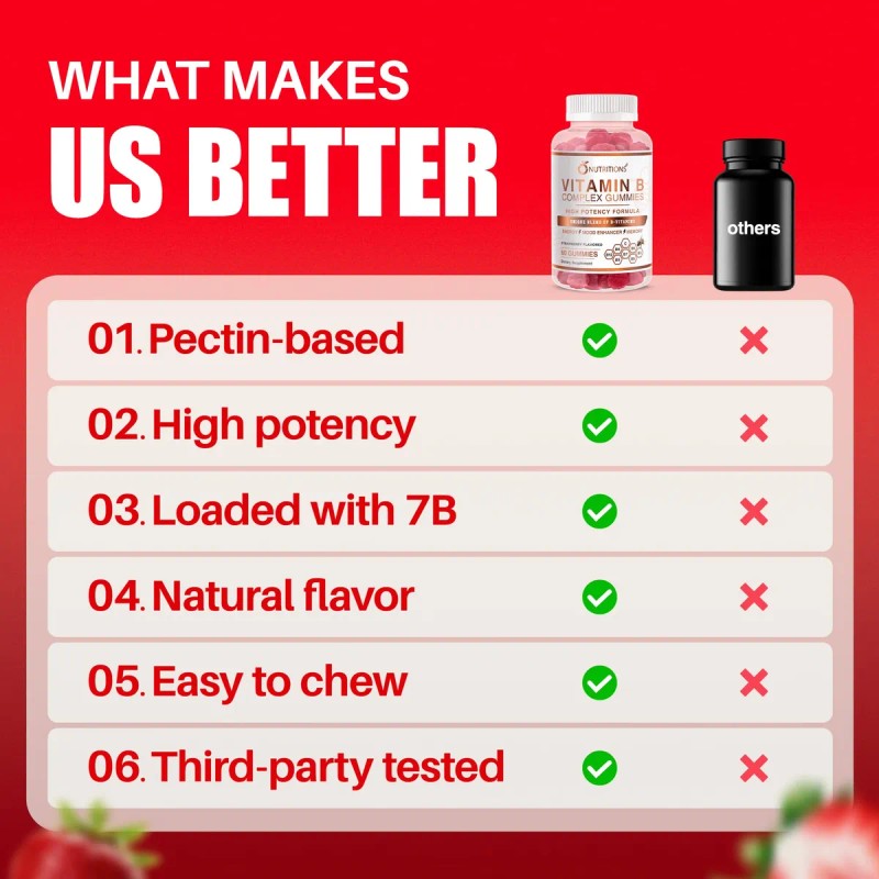 VITAMINAS B-COMPLEX POTENTES Y DELICIOSAS: Estas gomitas deliciosas facilitan la ingesta diaria de vitaminas B comparado con pastillas. La fórmula es tan potente que solo necesitas UNA gomita al día.