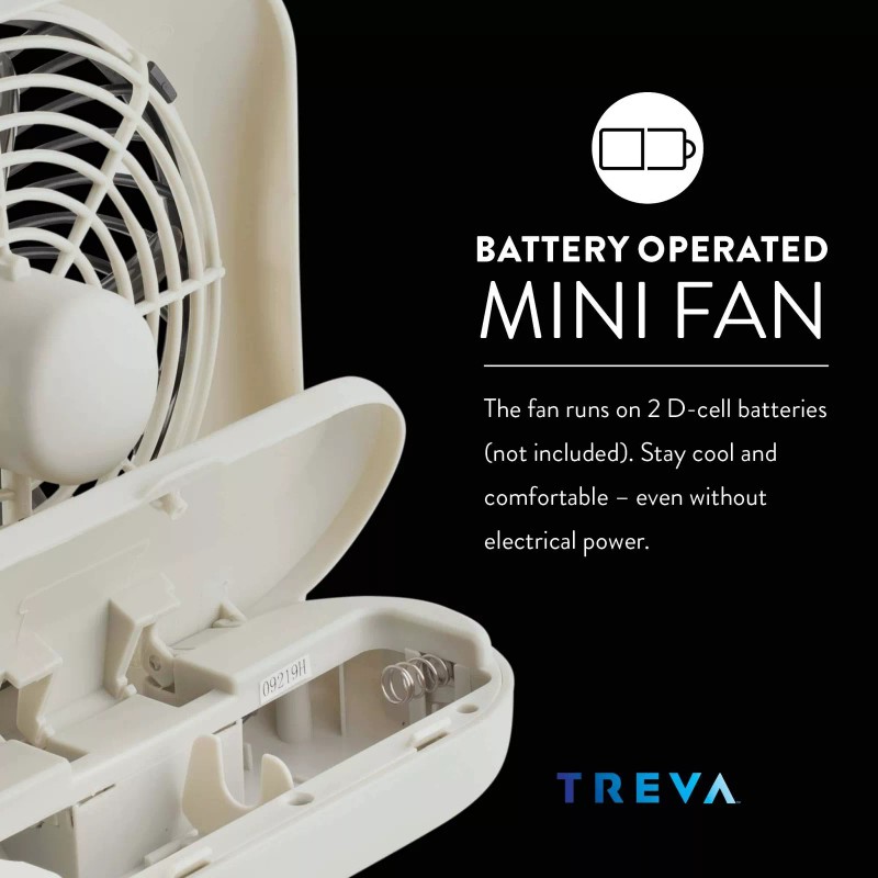- BATTERY POWER FAN - This 5-Inch portable fan from Treva runs on 2 D batteries (not included), cool gadgets for an awesome office desk accessories or floor fan for your summer cooling