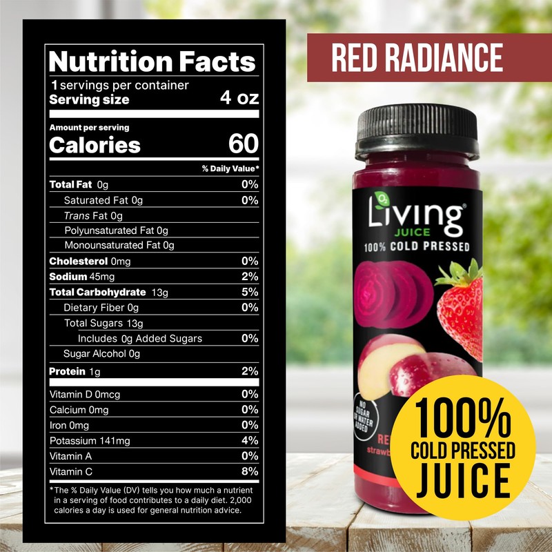 JUICE OVERVIEW With a mix of organic strawberry, red apple and beet, the taste and experience of our cold-pressed Red Radiance can't be beet! Red Radiance has a taste so sweet you wouldn't believe all the minerals, vitamins and essential fatty acids that are in just one bottle. Keep Living Juice refrigerated until you're ready to drink. All juices have an expiration date set to 30 days after production to ensure they remain as fresh as possible. We recommend that you drink your juice within 3-4 days of opening, but we bet you'll finish it faster than that! INGREDIENTS Red Beet, Red Apple, Strawberry All Living Juices are created fresh in our juicery with certified organic fruits and vegetables. We use a two-step juicer with a separate grinder and cold-press in order to maximize the availability of nutrients, vitamins, enzymes and minerals. Our organic cold-pressed juices are made without any water or sugar added! Order your fresh juices and cleanses for delivery today!