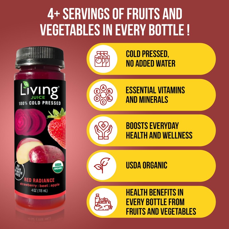O2 Living Red Radiance Organic Juice Drink - 4oz - 8 Pack - Cold-Pressed Juice Drink with No Added Sugars or Water, Natural Sweetness from Fruits, Packed with Nutrients and Vitamins, Refreshing Taste