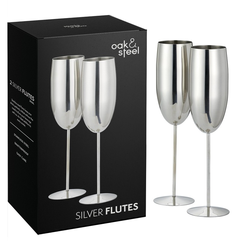 Oak & Steel - 2 Silver Champagne Flutes, 280ml - Stainless Steel Silver Prosecco Glasses with Gift Box
