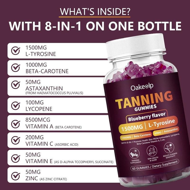 - 【Long-Lasting Tanning Effect & optimizing melanin production】: These tanning gummies are fortified with essential nutrients like 1500mg of L-Tyrosine and 1000mg of Beta-Carotene,8500mcg of Vitamin A to boost melanin synthesis. The key components work together to enhance your body's natural tanning process, ensuring you get the desired color