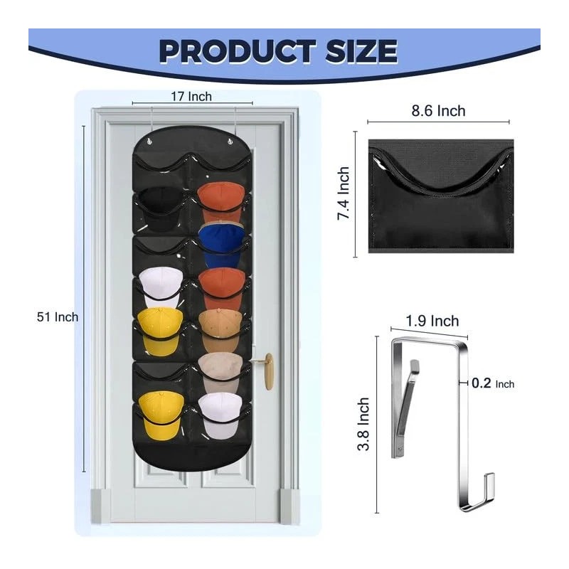 EASY INSTALLATION - Our cap hanger comes with 2 high-grade metal hooks and 2 adhesive wall hooks, metal hooks can be used in closet, you can also hang it to your door or wall, which makes your life more convenient. Overall dimensions:51in H x 17in W.(Pocket size: 8.3*6.9 in)