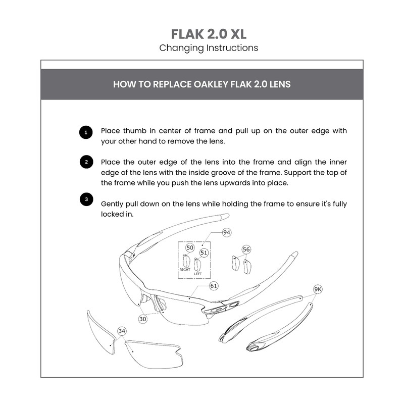 Customize the look of your FLAK 2.0 XL eyewear and get the best optical performance for where you use it most. All replacement lenses feature the unbeatable clarity, impact resistance and 100% UV filtering of Oakley's HIGH DEFINITION OPTICS (HDO).
