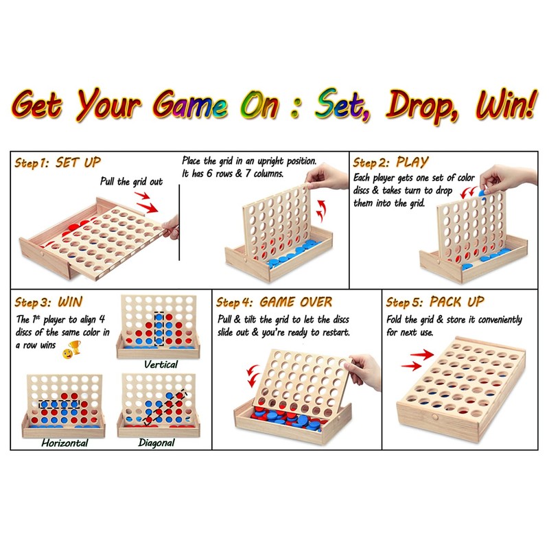 - Simple rules: The aim is to place four pieces of your own colour in a row, column but also diagonally before the opponent can do it.