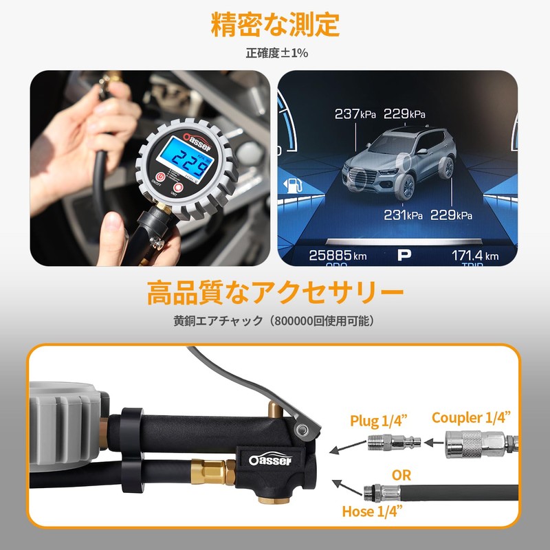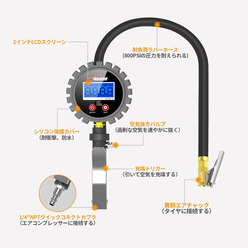 Oasser Air Gauge, Digital Air Chuck Gun, 1800 kPa, 255 PSI, Tire Gauge, Air Pump, Deflation, Measurement P5