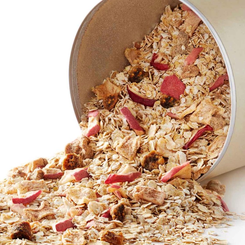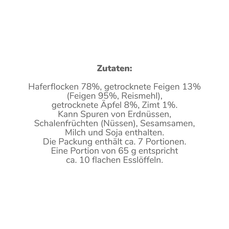 - Ingredients: oatmeal 78%, dried figs 13% (figs 95%, rice flour), dried apples 8%, cinnamon 1%. May contain traces of peanuts, nuts, sesame seeds, milk and soy. The pack contains approx. 7 servings. A serving of 65 g corresponds to approx. 10 flat tablespoons