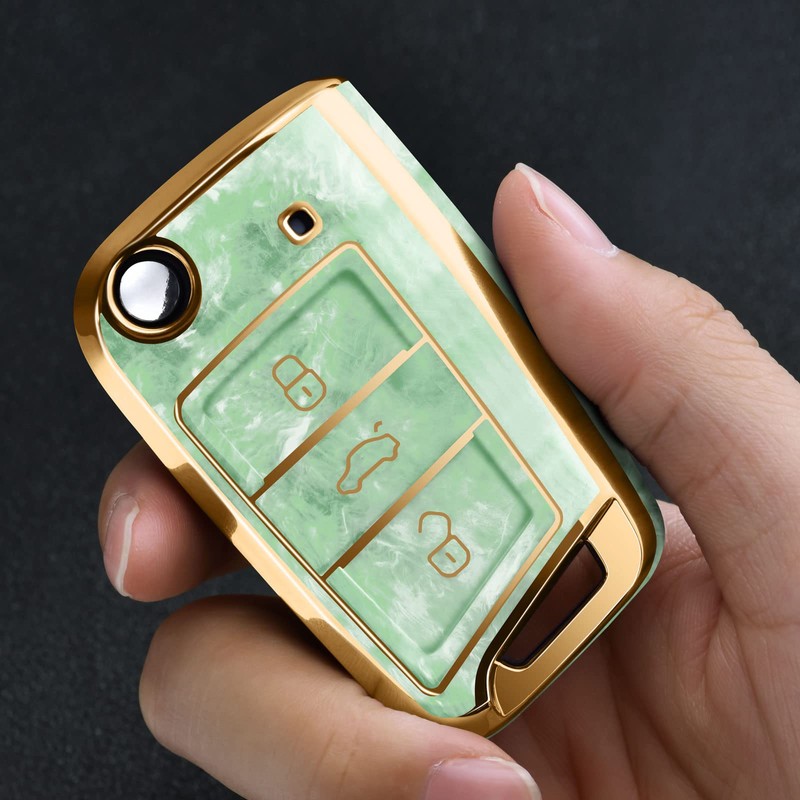 OATSBASF Car Key Case VW, VW Golf 7, Key Box, Key Cover for VW Polo, Skoda, Seat, 3 Buttons (B-Green)