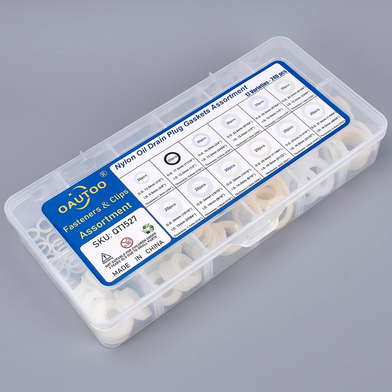 - 🔧 Multiple Solutions- Includes 12 Sizes Nylon Oil Drain Plug Gaskets, Total 240 Pieces. These Are Reliable Replacement for the Original Part That had Missing or Failed Due to Fatigue.