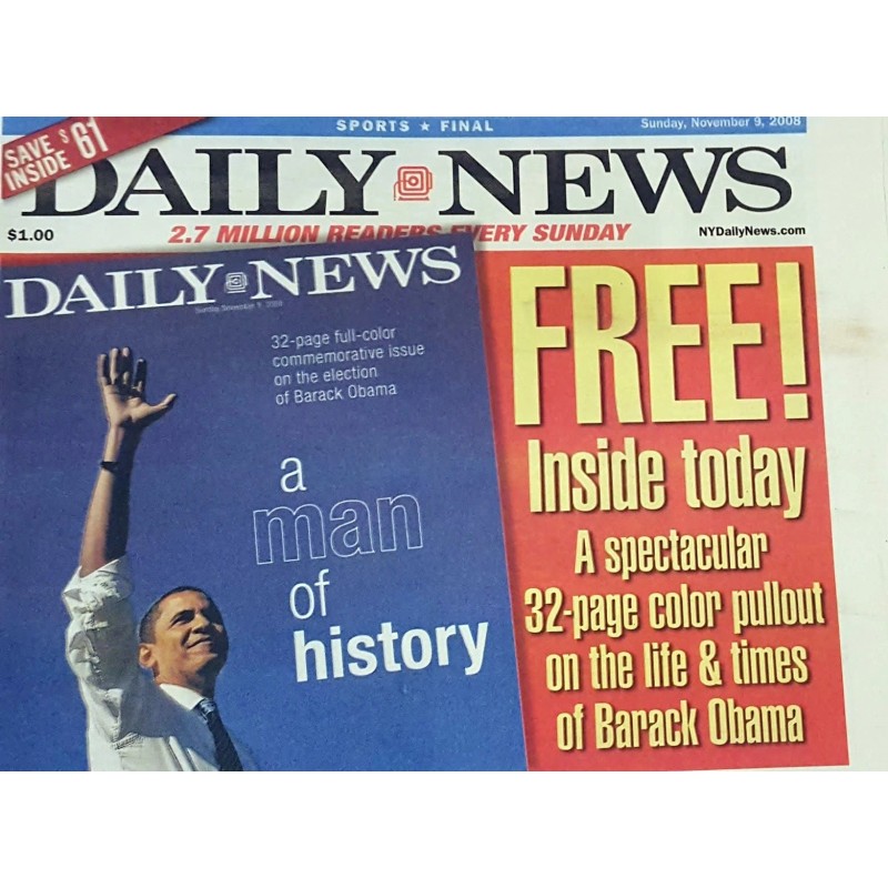 Obama DAILY NEWS Sunday Nov. 9 08 Collector's Sold Out Issue & 32 Pull Out FREE