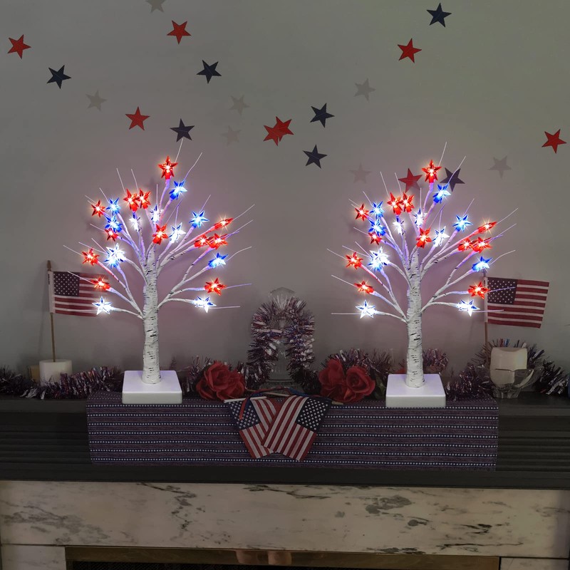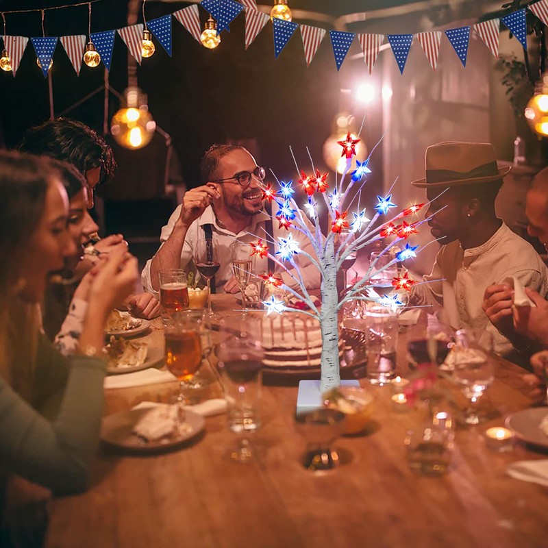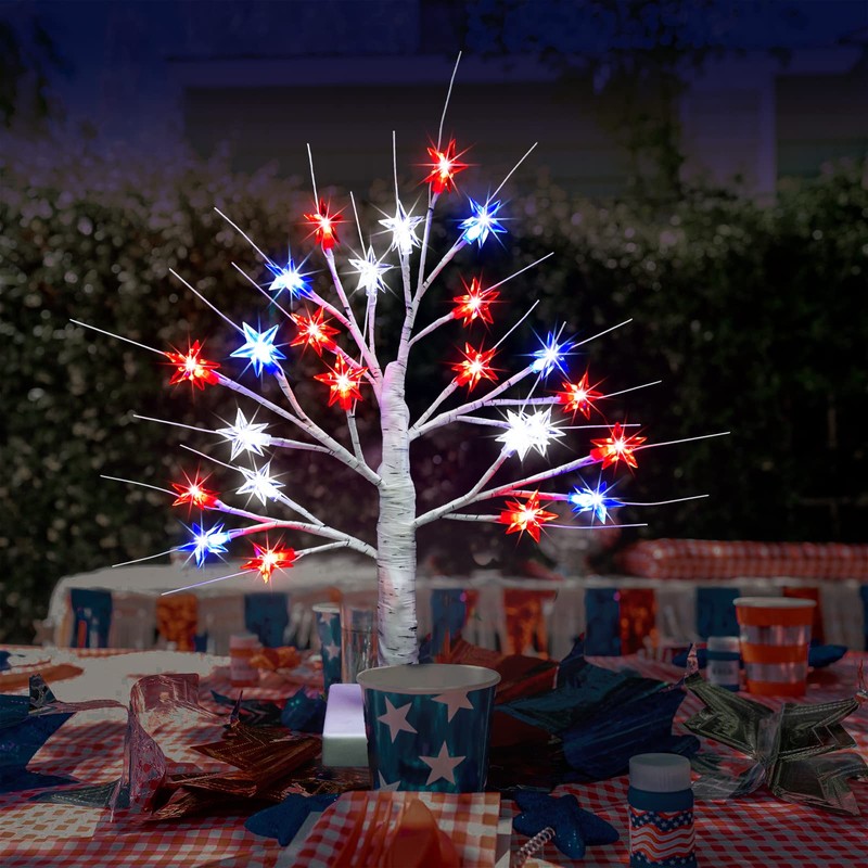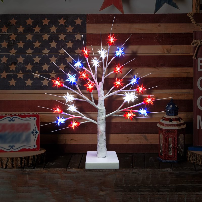 - This beautiful patriotic tree light with 24 red white and blue LED star lights designed with the same colors with American flag, creating a grand view and solemn ambience. Brighten up your 4th of July celebrations with our patriotic tabletop tree Light that add the perfect touch to your American-themed party decor