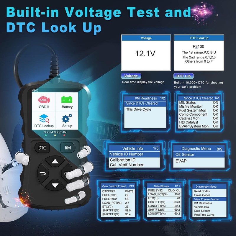 • Improved OBDII service modes: equipped with full OBDII modes, supports iKiKin V600 auto scan tool O2 sensor test and EVAP test on vehicles that use CAN protocol. It can be used to detect the oxygen content in the exhaust gas, which is important for diagnosing and repairing engine performance problems. And let you start a leak test for the EVAP system of the car.