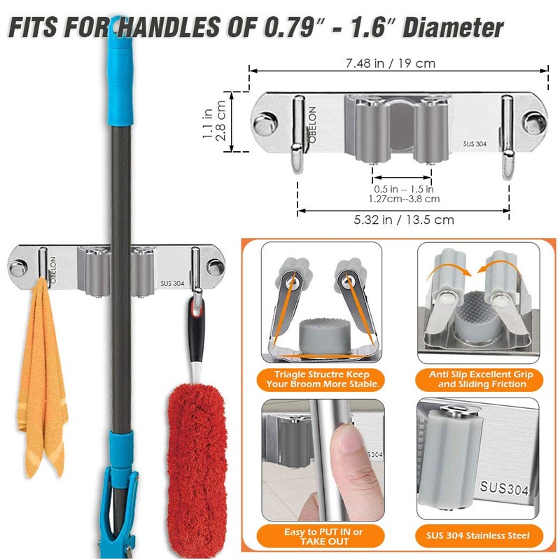 - 【Save Space】The stainless steel mop broom tool organiser holder helps to sort brooms, mops, brushes, shovels, rakes, garden tools etc. OBELON organiser is the best helper for home, kitchen, bathroom, garage or garden, and can also be the best gift for your elders, order now to get it right away!