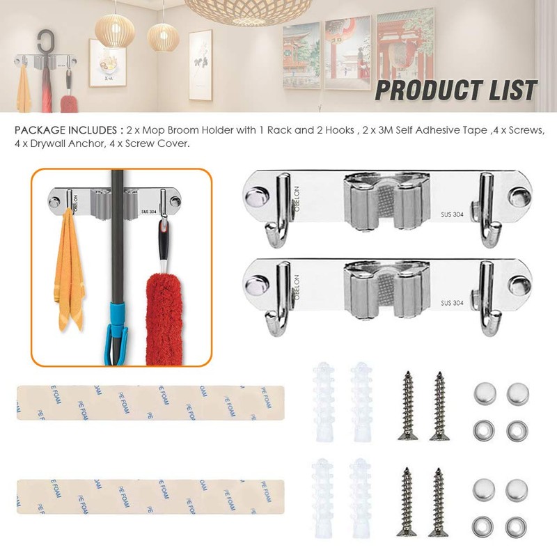 2 x OBELON Broom Mop Holder with 1 Racks 2 Hooks
