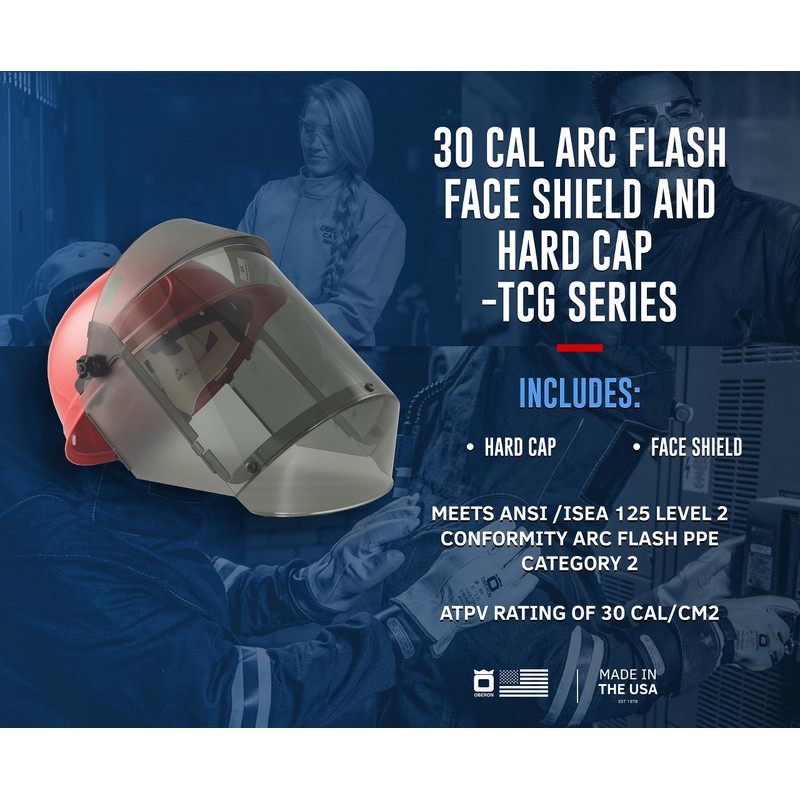 • 30 CAL ARC FLASH FACE SHIELD & HARD CAP: Oberon’s 30 Cal TCG Face Shield and Hard Cap are worn by workers in industries that require electrical safety and covers a minimum of 30 calories where PPE is required. Suitable for electricians and other electrical workers in industries such as utilities, manufacturing, construction, and maintenance.