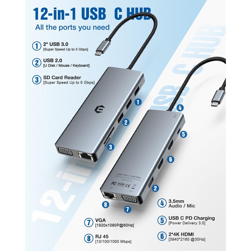 - 【12-in-1 USB C Docking Station】 12-in-1 USB C Docking Station has 2 HDMI, VGA, 100W PD, 2 USB 3.0, 2 USB 2.0, Ethernet, SD/TF Card Readers, Mic/Audio a total of 12 ports to meet your needs. Simply plug in the USB-C connector to extend the functionality of your device.