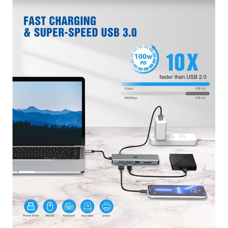 - 【Max 100W PD Charging & Reliable Data Transfer】 The USB C PD charging port supports up to 100W Power Delivery, which helps shortening the charging time. Please make sure that your device support power delivery protocol. 2 USB 3. 0 ports supports super fast data transfer up to 5Gbps, allow you to transfer HD movies or large files in seconds. 2 USB 2.0 ports support up to 480Mbps. SD & TF/Micro SD card slots data transfer at up to 5Gbps and up to 512GB memory.