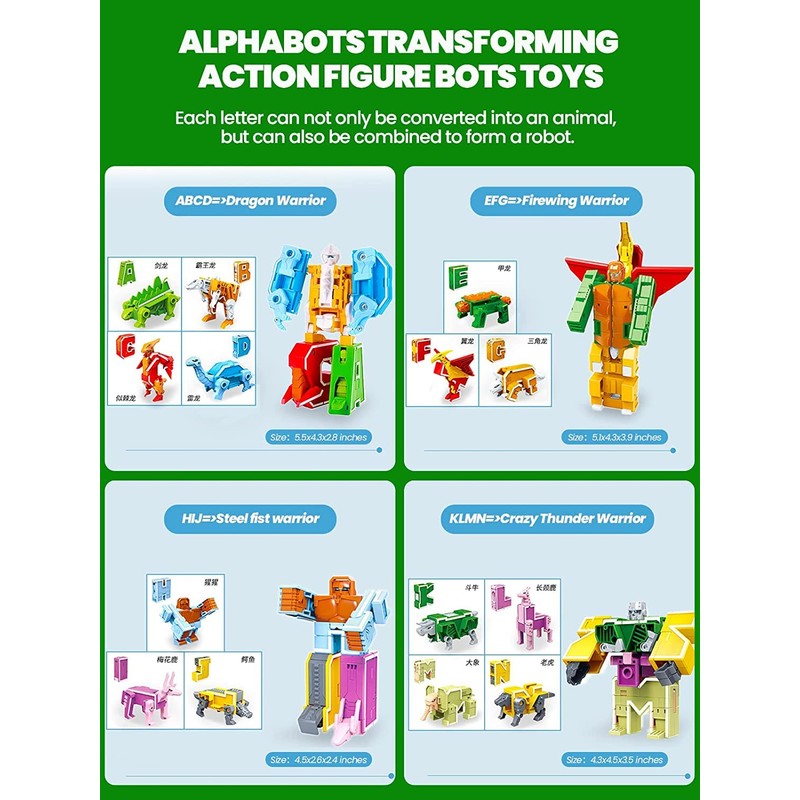 - DELICATE CRAFTSMANHIP: each alphabet in our dinosaur toy can independently become a small animal, a small robot, and can also be combined into a robot warrior. Pure color, clever design, realistic modelling.