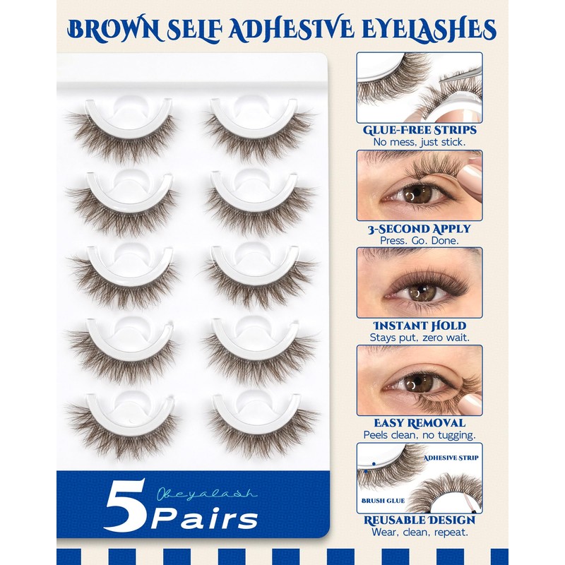 Obeyalash Waterproof Brown Self Adhesive Eyelashes,Cateye 12mm,5 Pairs Stick on False Eyelashes,Pre Glued Lashes, No Glue Needed,Wispy Glueless Lashes Reusable Self Adhesive False Eyelashes(Brown 872)